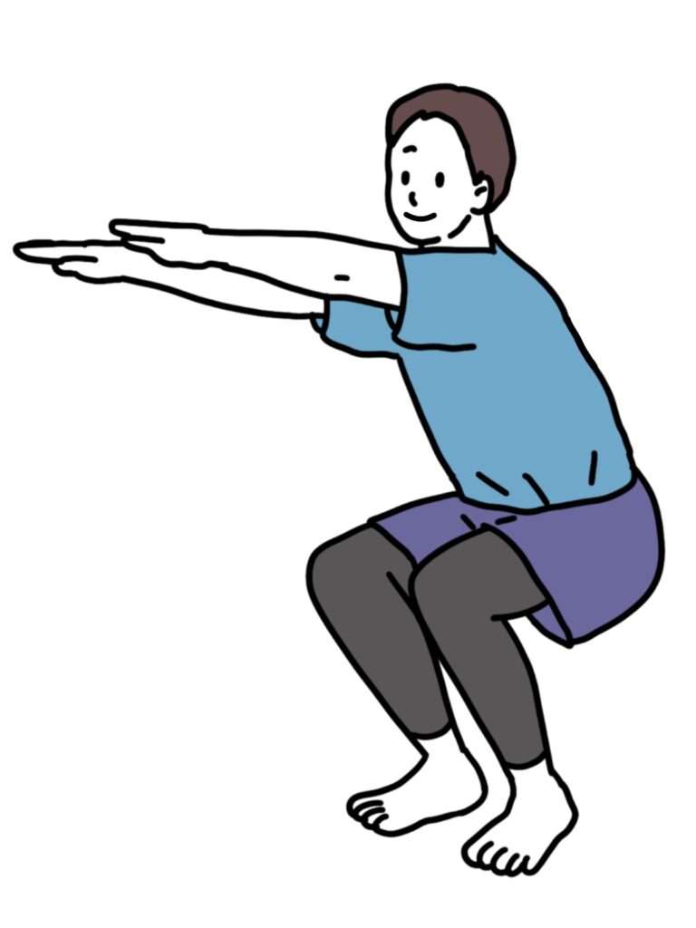 筋肉は微量ながらテストステロンを産生しているので、男性更年期の対策には筋トレがおすすめ。大きな筋肉である太ももを動かすスクワットが効果的です。外出時はエレベーターやエスカレーターではなく、できるだけ階段を使うなどもおすすめです。