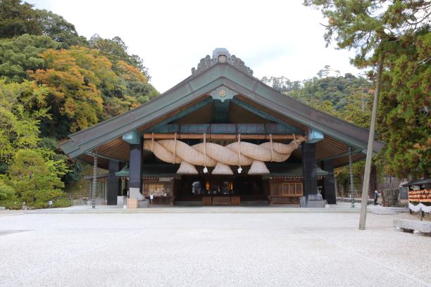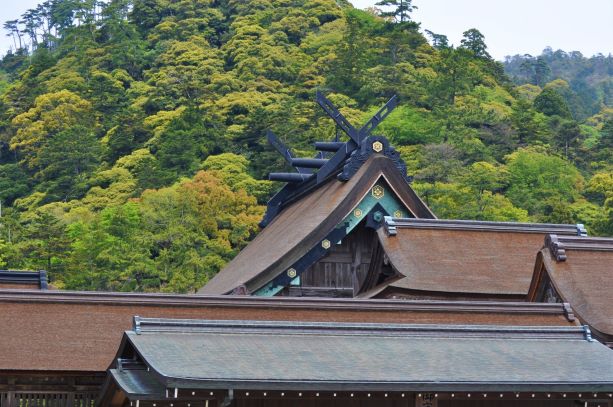 出雲大社本殿(奥の三角形の屋根)。大社造りという古い社殿形式で建てられています。巨大さも特徴の一つですが、古代はもっと高層建築であったと言います。