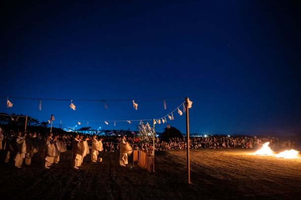 かがり火(御神火:ごじんか)が焚かれた砂浜に神職が並んで、海の向こうから訪れる神々を迎えるという、荘厳で幻想的な神事です。