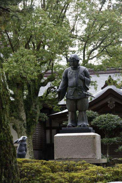 出雲大社境内にある因幡の白ウサギと大国主大神の像。若き日の大国主大神は八十神(やそがみ)という兄神たちの求婚旅行に荷物持ちとして同行。その途上、皮を剥がされた兎と出会い、治療法を教えました。ここから大国主大神は医薬の神ともされています。