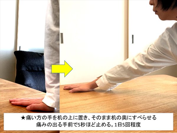 - 痛い方の手を机の上に置き、そのまま手を机の奥にすべらせていきます。