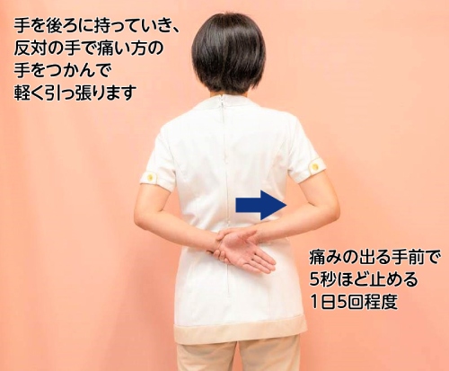 - 反対の手で痛い方の手をつかんで、体の後ろに軽く引っ張って伸ばします。