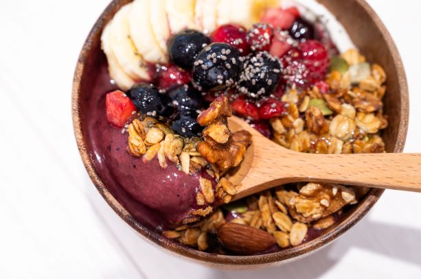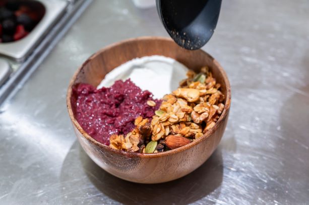 まずは器にグリークヨーグルトとアサイーをたっぷり盛り付けて、ミックスナッツ入りのグラノーラをトッピング。