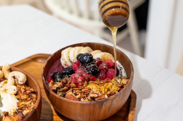 バナナとミックスベリーを乗せたら、仕上げにチアシードとはちみつをトッピングして完成です!アサイーにたくさんのフルーツ、これまたスーパーフードと呼ばれるチアシードに、栄養価たっぷりのはちみつと、体にいいもののオンパレード!これには、オーナーの永田萌依(ながたもえ)さんの想いが込められています。
