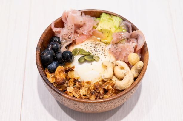 お店には“お食事系”の「アボカド」(1,760円)も。アサイーは入っていませんが、グリークヨーグルトにアボカド、生ハムなどを盛り付けてブラックペッパーとはちみつをトッピング。整腸効果があるヨーグルトと血液さらさら効果の期待できるアボカドのかけ合わせを、サラダ感覚で楽しめます。