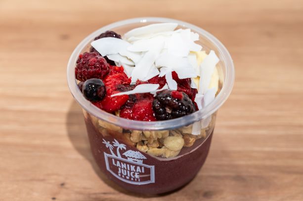 ほどよい甘みと渋みの冷たいアサイーベースに、ミックスベリーの酸味とナッツやグラノーラのざくざく食感が相まっておいしい!さすがハワイNo.1です。
