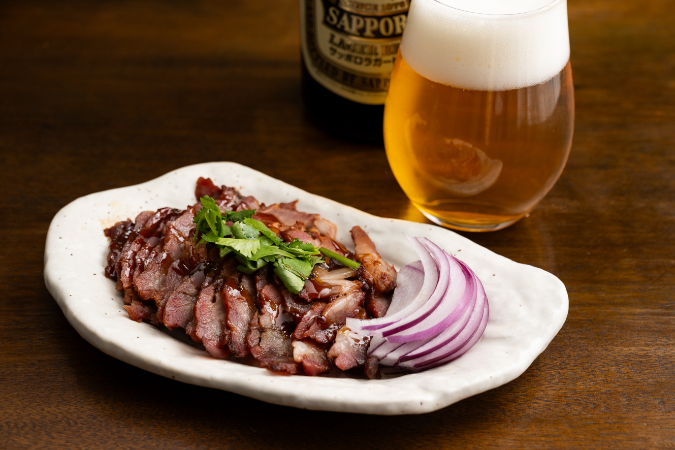 「自家製ラム肉のチャーシュー」1,210円は、ラムの肩ロースを調味料に1日漬けて、味がしみ込んだら窯の炭火で焼いているそう。ほどよい甘みと、しっとり柔らかい肩ロースの旨味がたまりません!