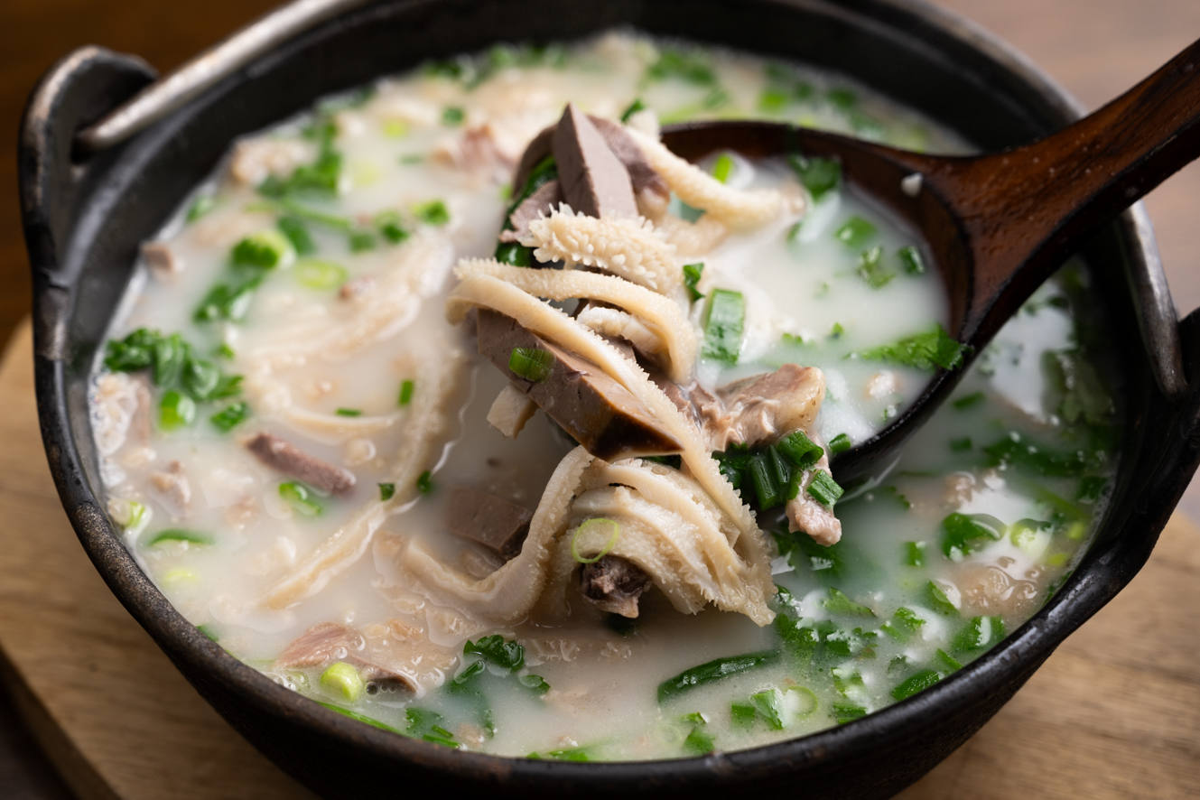 羊の骨肉を15時間以上煮込んだ、とろっとしたコラーゲンスープで胃袋や肺、心臓、舌など6種類のモツを煮込み、塩とコショウだけでシンプルに味つけ。