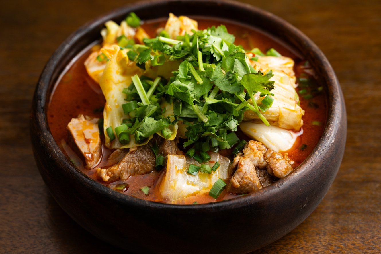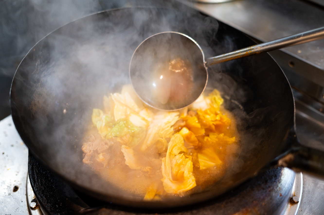 バラ軟骨を1時間以上煮込んで自家製の辛味噌で味つけた柔らかいお肉とスープでキャベツと白菜をサッと煮込みます。