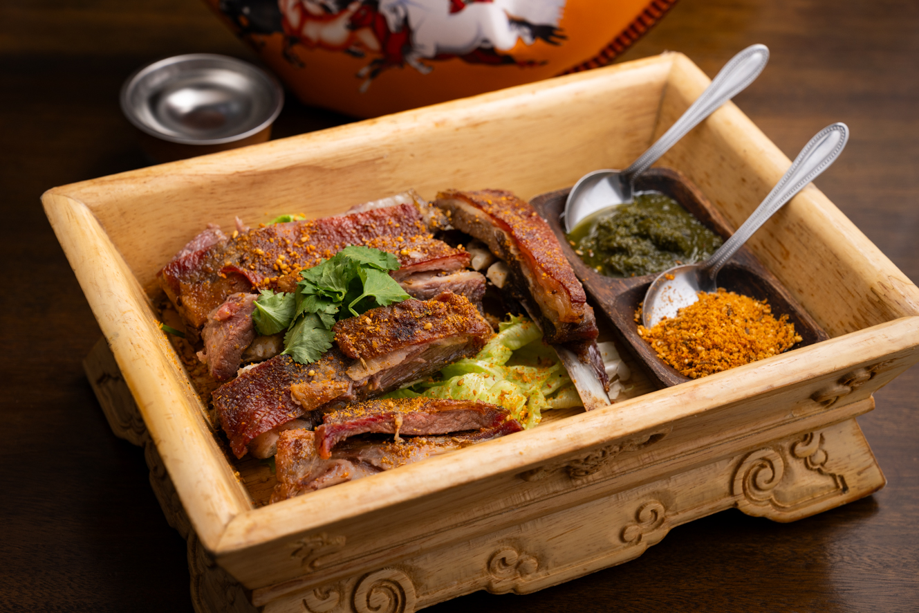 「肉付き背骨焼き(小 約400 g)」2,900円。ヒレ肉の背骨焼き。「量が取れないヒレ肉は、内モンゴルでは高齢者や来客などしか食べられない貴重な食材です」とスヨリトさん。