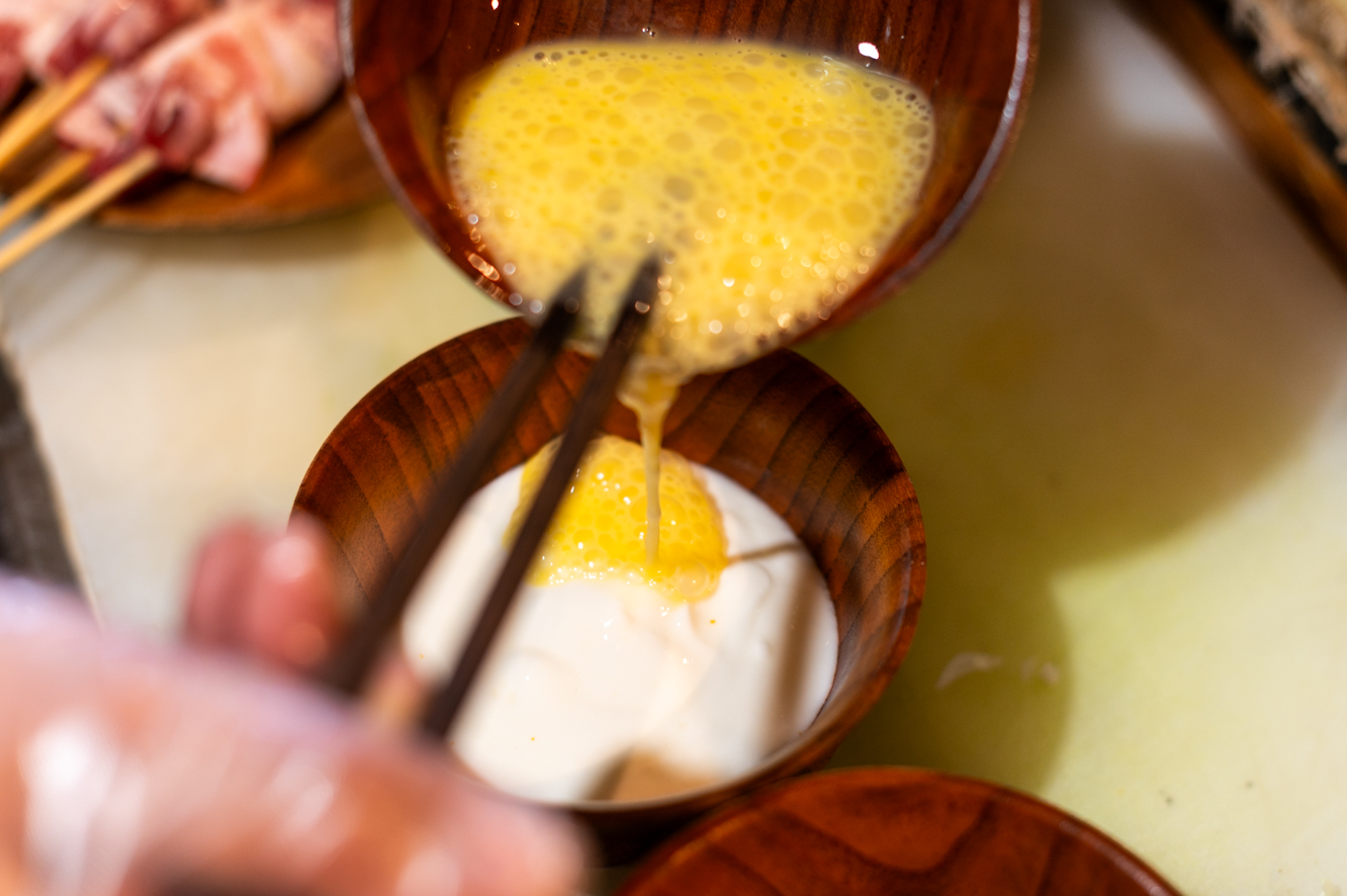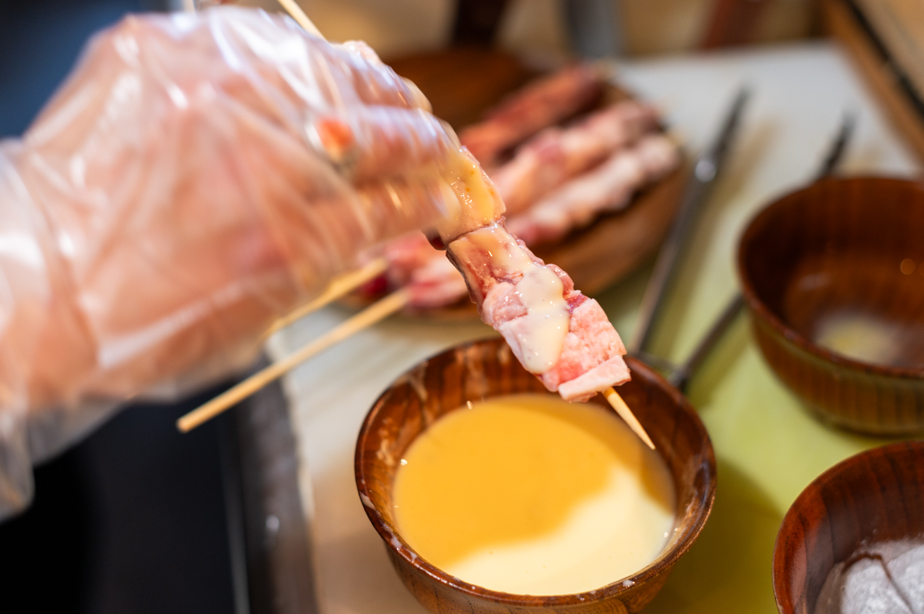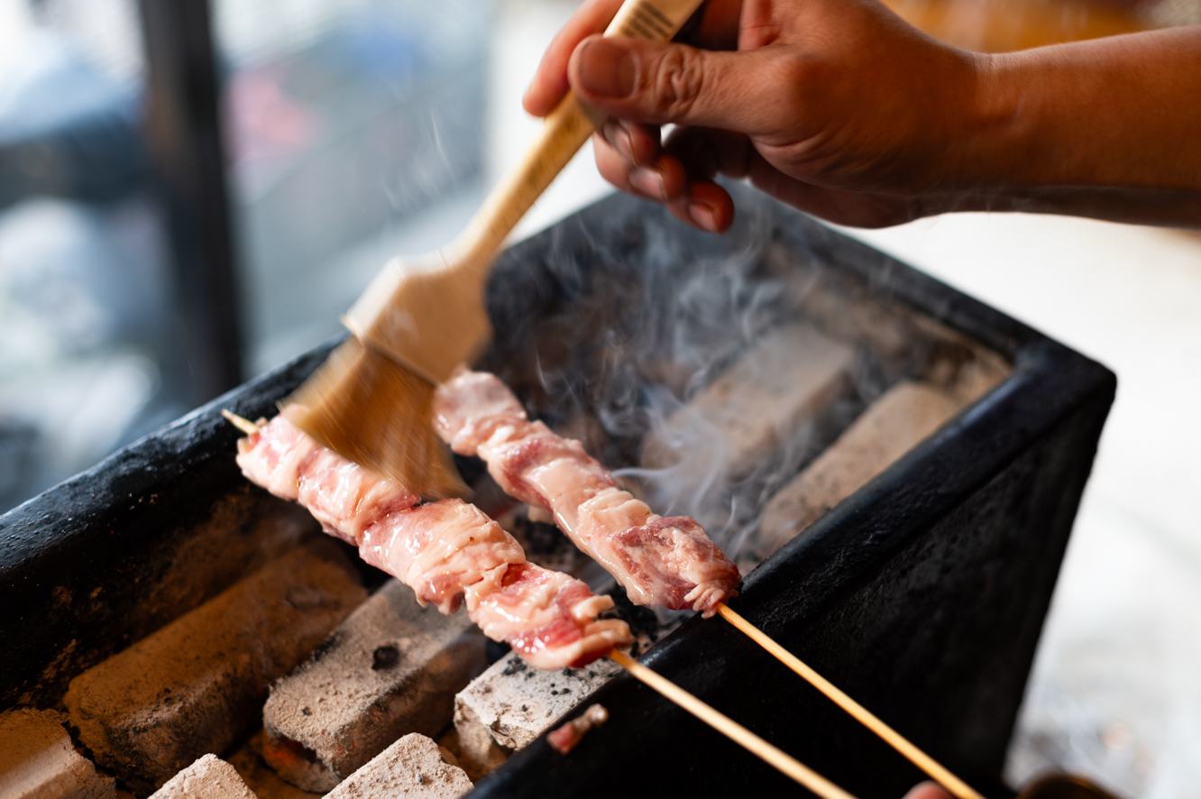 ヨーグルトに溶き卵と塩、片栗粉を加えたマリネ液を串打ちした肉に塗り、皮がやわらかくなるまで2時間ほど置いたら炭火で焼いていきます。