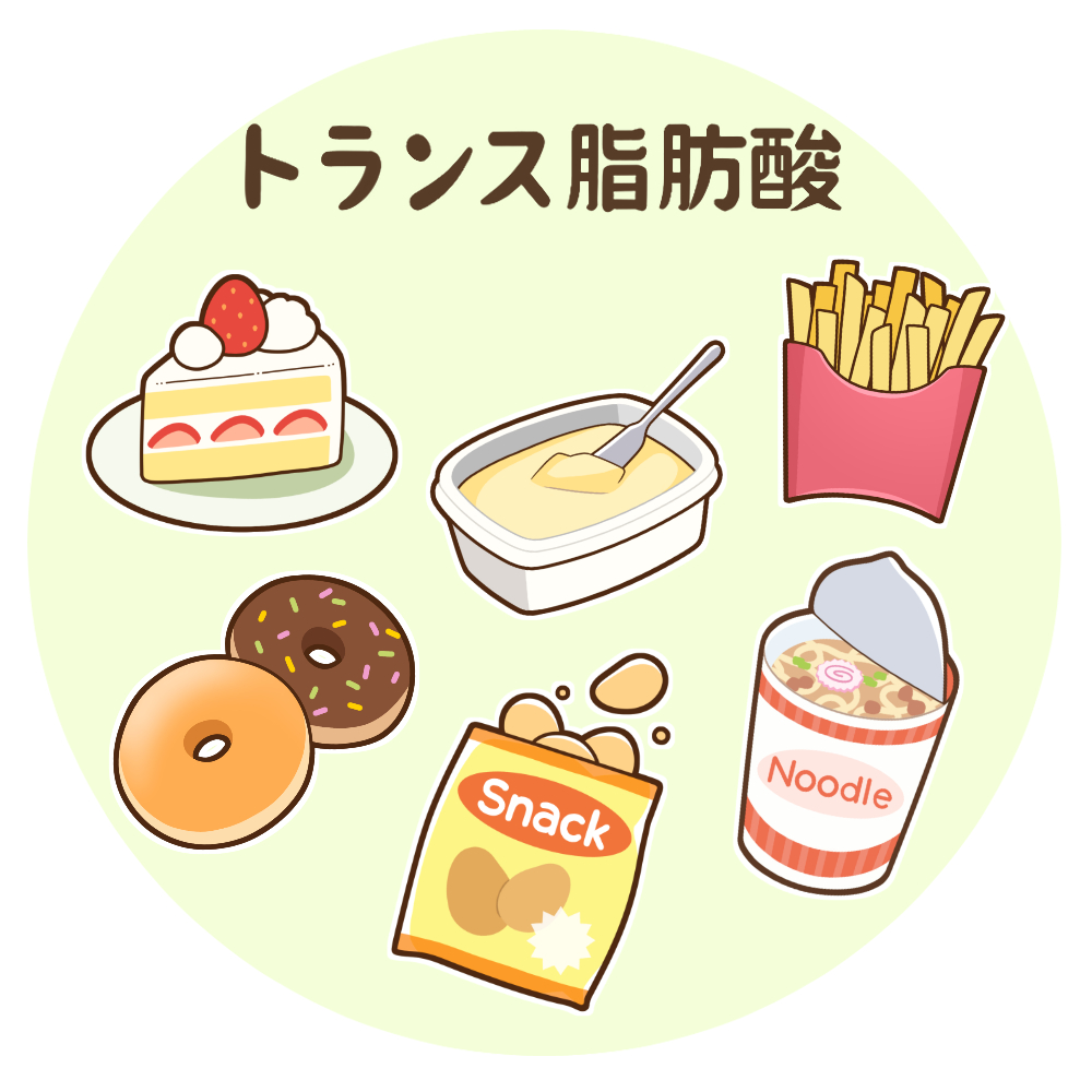上記を使ったケーキやドーナツ、高温で揚げたスナック菓子や揚げ物、インスタント食品などにも多く含まれています。