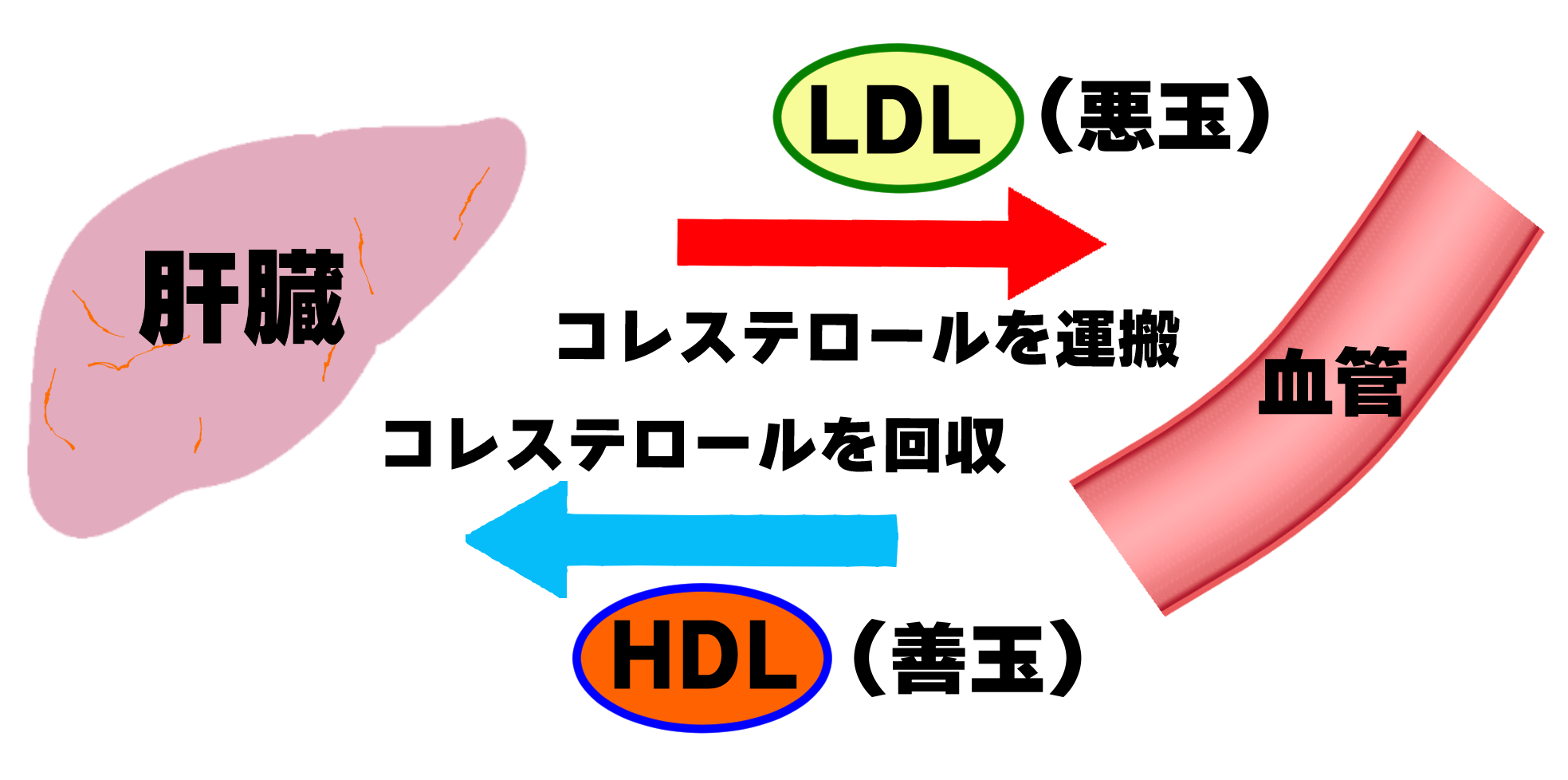 体に重要な栄養素であるコレステロールの約80%は肝臓で作られていて、コレステロールを肝臓から全身に運んでいるのがLDL、血管内の余分なコレステロールを回収して肝臓に戻すのがHDLです。