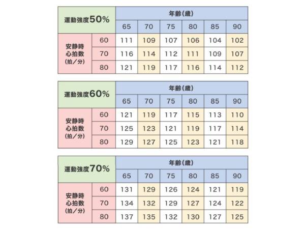 たとえば、65歳で安静時心拍数が70の場合、運動強度50%のトレーニングをした際の脈拍数が116前後であれば、適正な運動強度と考えられます。