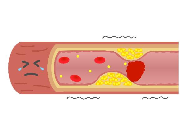 血管が硬くなり、内側に悪玉コレステロールなどがたまるとコブ(プラーク)や血栓ができ、血液の流れが悪くなって詰まりやすい状態になります。