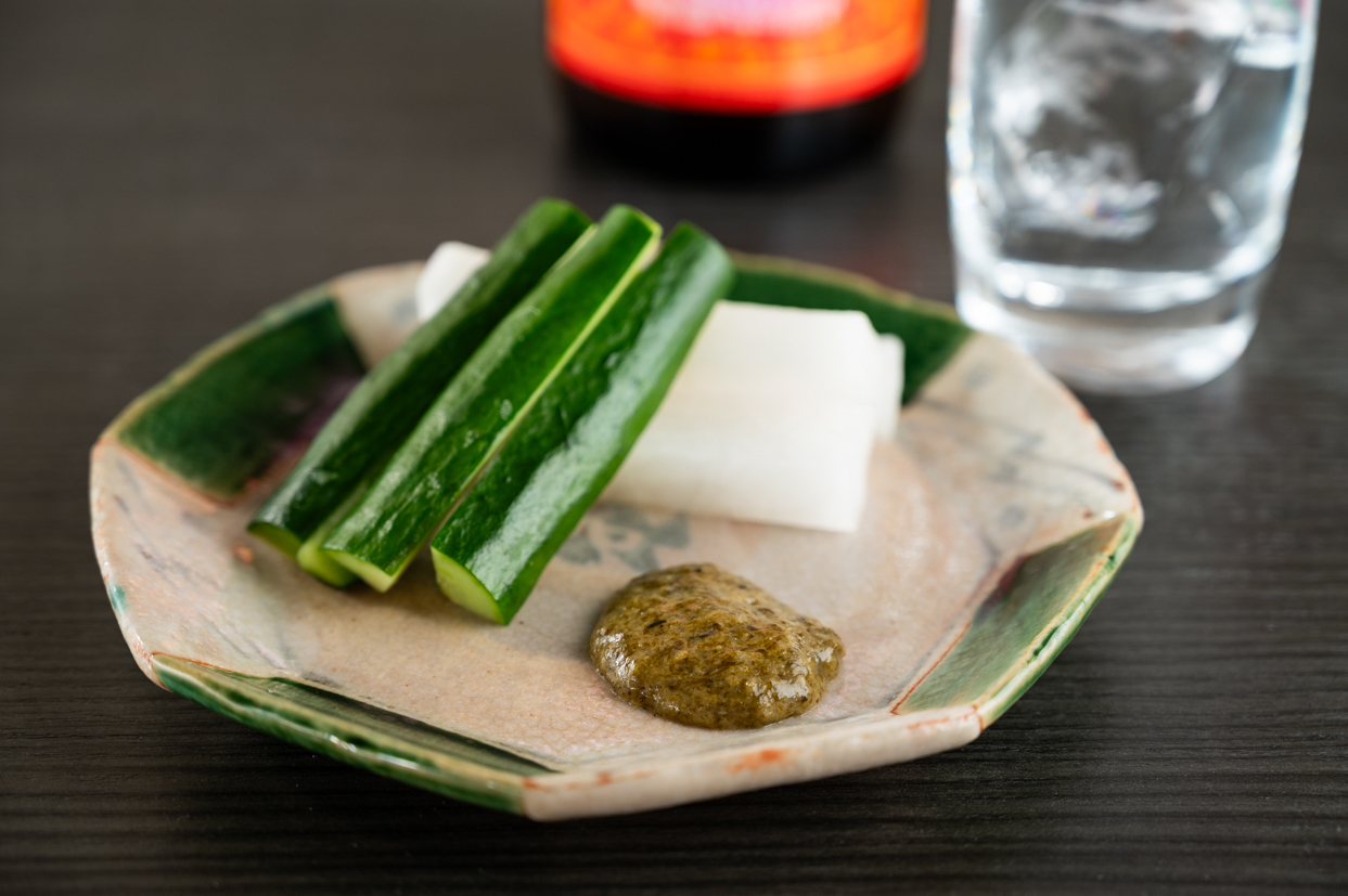 材料を混ぜるだけの簡単さですが、味噌の麹の香りと海苔の佃煮の優しい甘み、マヨネーズのコクが焼酎にぴったりです。写真のように大根やキュウリのスティックにディップしていただきます。湯豆腐やおでんにつけてもおいしい。