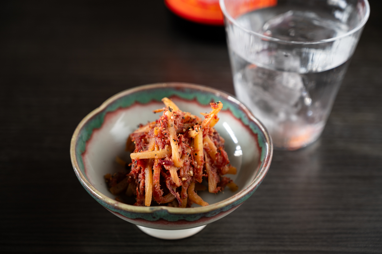 筍の香りとコンビーフの旨味が混ざり合い、黒コショウの香りもよいアクセントに。筍のような少しえぐみのある食材は、焼酎の風味によく合います。筍の代わりに、ごぼうで作ってもおいしくできあがります。