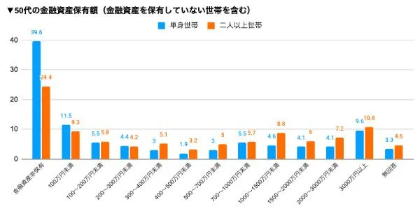 しかし、50代の金融資産保有額(金融資産を保有していない世帯を含む)は、上のグラフのようにばらつきがあります。