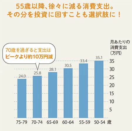 50代は子どもの教育費や住宅ローンの支払いなどの影響で、消費支出(生活費/家計費)がピークになりますが、それ以降は徐々に減っていきます。
