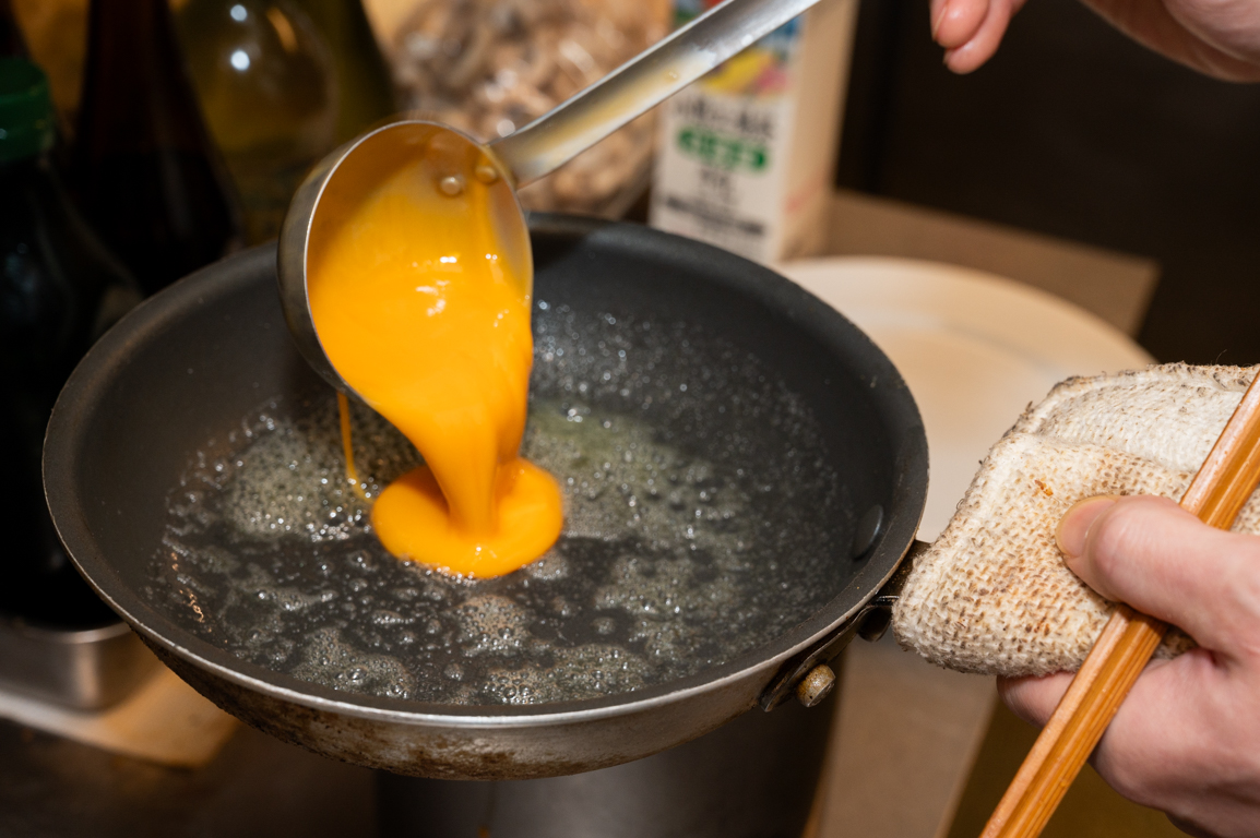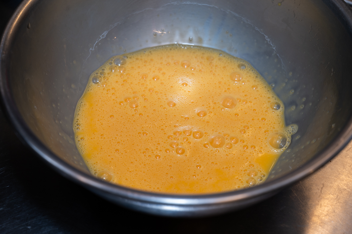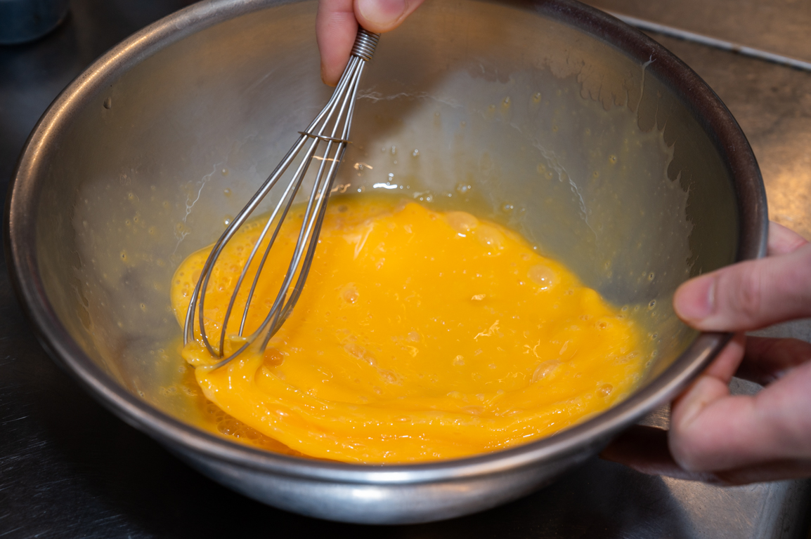 卵は、白身のドロッとした感触がなくなるまでしっかりと混ぜる。