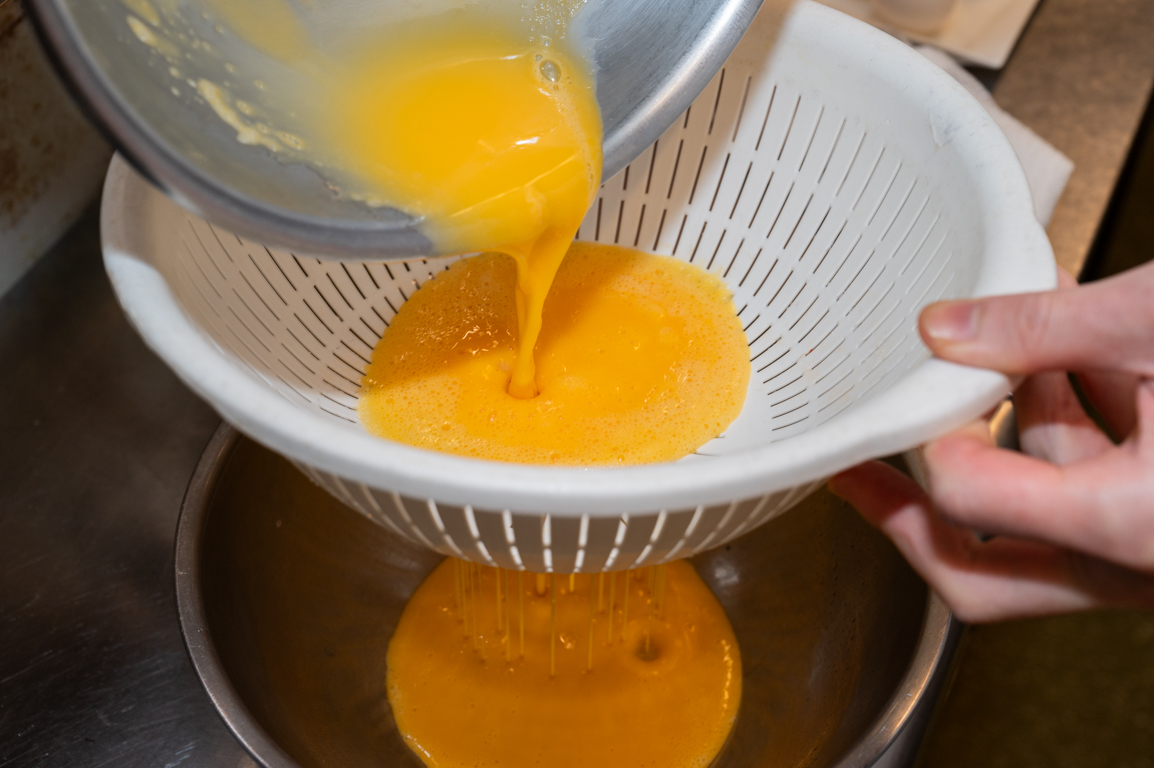 ザルで濾して殻やカラザ(卵黄に付いている白いひも状のもの)を取り除き滑らかな状態にする。