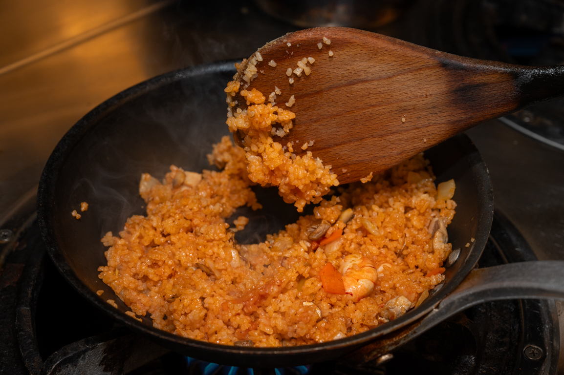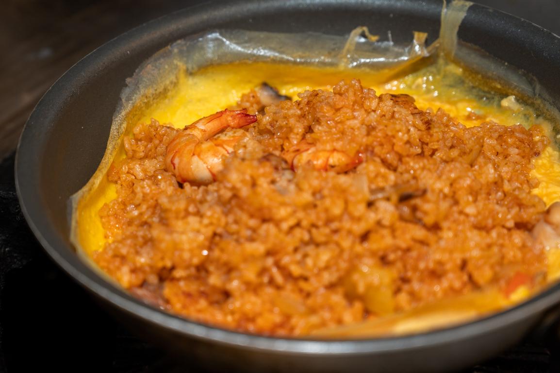 当店のオムライスで使うごはんは、フライパンに白米と水、チキンブイヨン、トマトペーストを入れて熱湯で焚き、その後オーブンに入れてパラパラの状態に仕上げます。