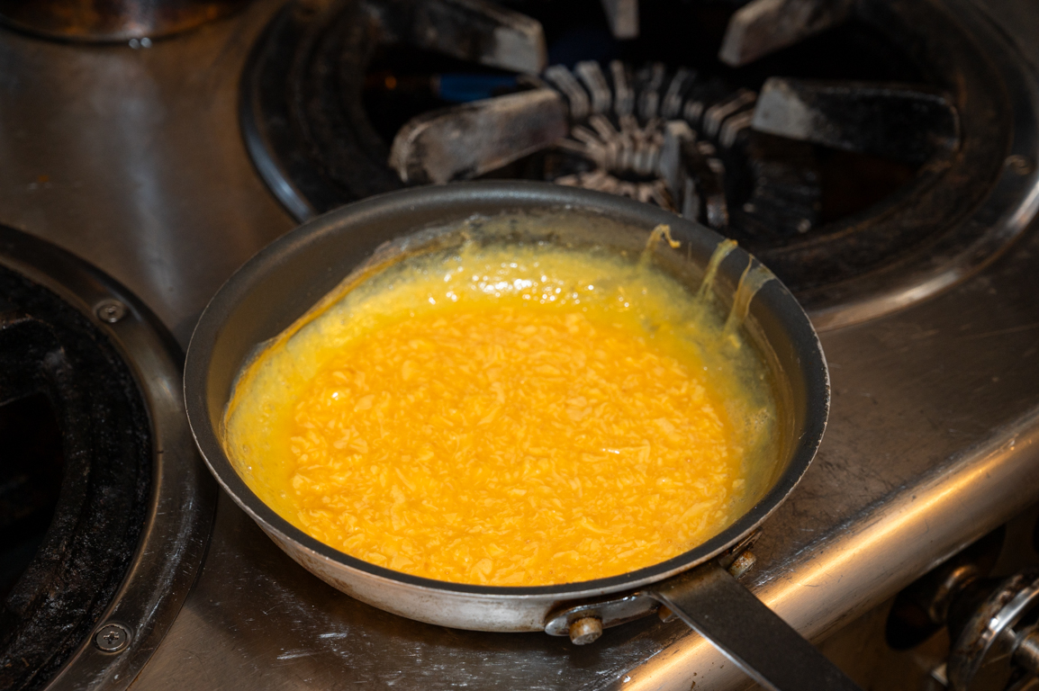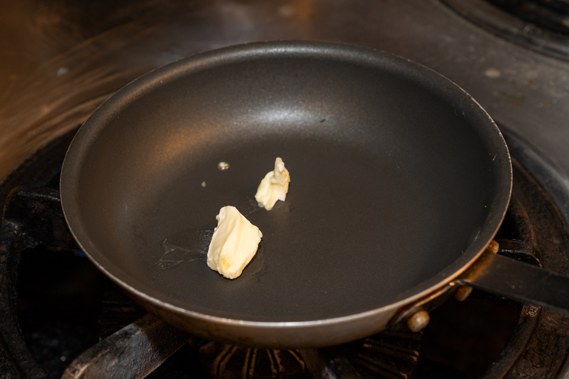 9 別のフライパンにバターを入れて弱火から中火にかけて温める。バターが溶けたらいったん火から外して4の卵液を入れる。フライパンはテフロン加工がされていて、ひとり分の量にちょうどいい大きさの物を使うのがオススメ。お店では22センチサイズのフライパンを使用。