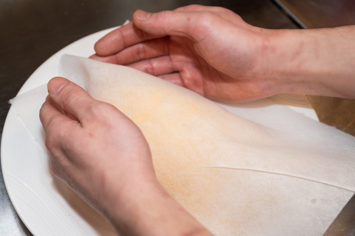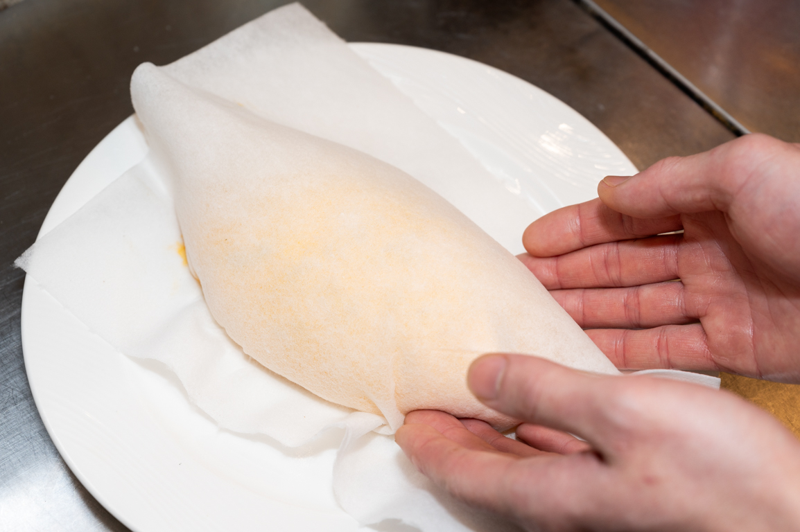15 キッチンペーパーを被せて、ラグビーボール状になるように手で成型する。