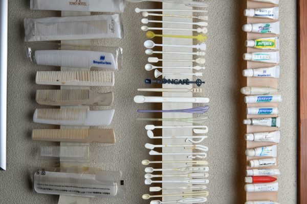 町田さんがコレクションしている「資料」は、実にさまざま。甘栗、蚊取り線香、アイスといった商品パッケージから、飛行機内のシートポケットに入っているエチケット袋、街頭で配布しているポケットティッシュ、書店でもらえる無料のしおりなど、およそ150種にも上ります。