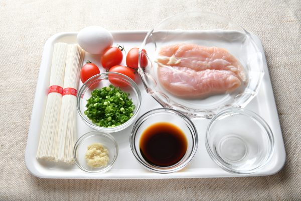 1、そうめんを「基本の茹で方」にならって茹で、ザルに上げて水気を十分に切っておく。