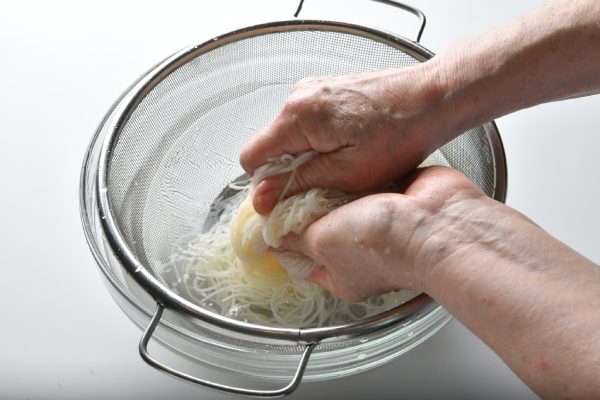 4、茹で上がったらざるにそうめんをあけて湯をきり、冷水を張ったボウルに移す。流水の下でそうめんを両手でもみ洗いしてぬめりをしっかり取り、こしを出す。