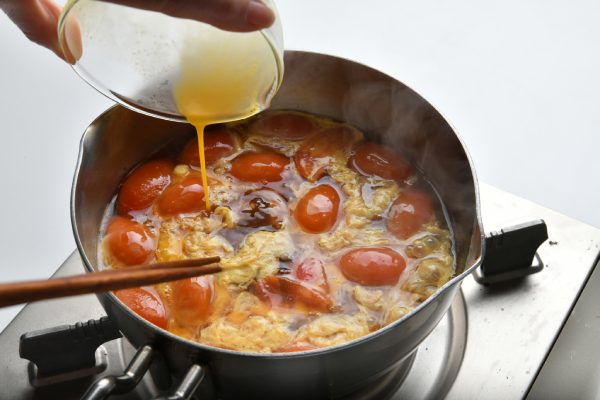 2、鍋に水を入れて火にかけ、トマトも加えて煮る。沸騰したら火を弱めて2分ほど煮る。めんつゆと鶏ささみを加えて残りの酒を加え、菜箸でほぐす。