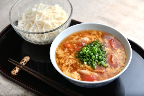 暑いとつい、冷たい飲み物や食べ物を摂り過ぎて、胃腸がダメージを受けがちですよね。体内に貯まった熱を取る効果のあるトマトを温かい「つけ汁」にし、さらに体を温める効果のあるショウガを加えることで、胃腸にやさしい一品に。ささみが入って、タンパク質もしっかり摂れます。つけ汁は、トマトの酸味を卵がマイルドにしたやさしい味です。