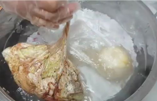 4. 袋ごと取り出したら、ふきんでよくもんでつぶす。