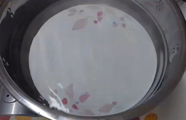 鍋の底に皿やざるを敷いて、ポリ袋を破れにくくします。
