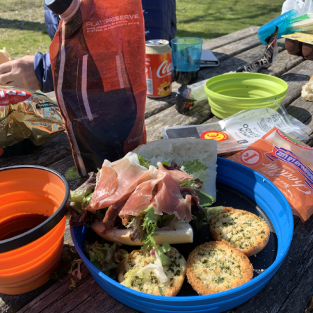 昼食は、バゲットに生ハムやチーズを挟み、道端で食べることもしばしばでした。暑い日はサラミに替えたり、リンゴをかじったりします。シンプルですが、歩き続ける体には、これ以上ないご馳走です。