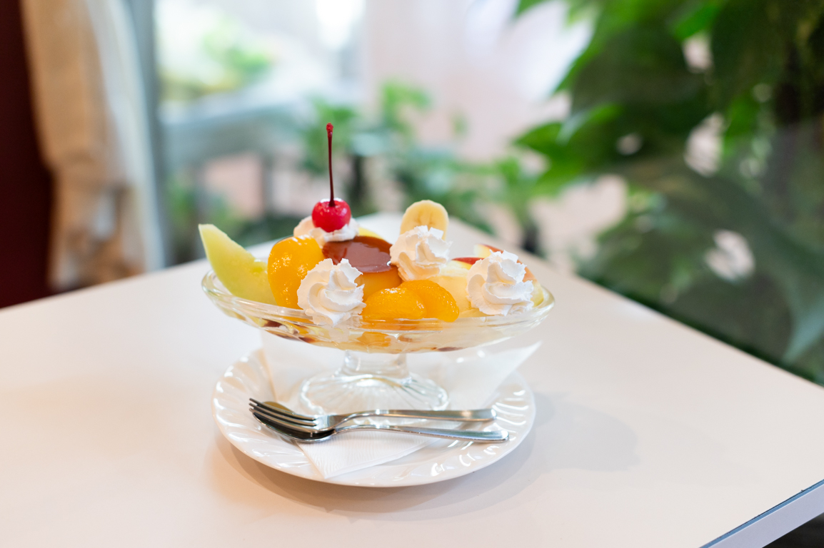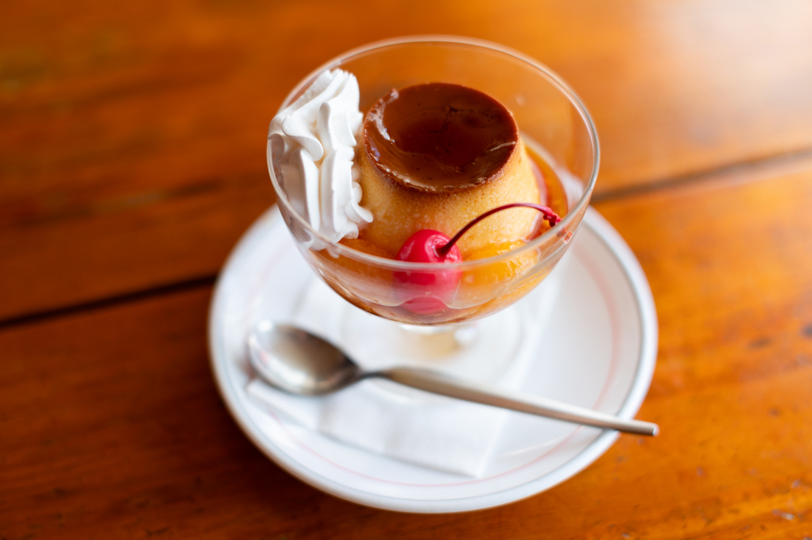 プリンはしっかりと硬く、スプーンが入りづらいほど。甘さ控えめでラム酒がほんのり香る大人向けのプリンです。盛り付ける器は、職人さんの手仕事による温かみのあるガラス製。フルーツやホイップクリーム、アイスクリームが添えられ、さくらんぼが美しく飾られたプリンア・ラ・モードの極みといえる見た目とおいしさです。