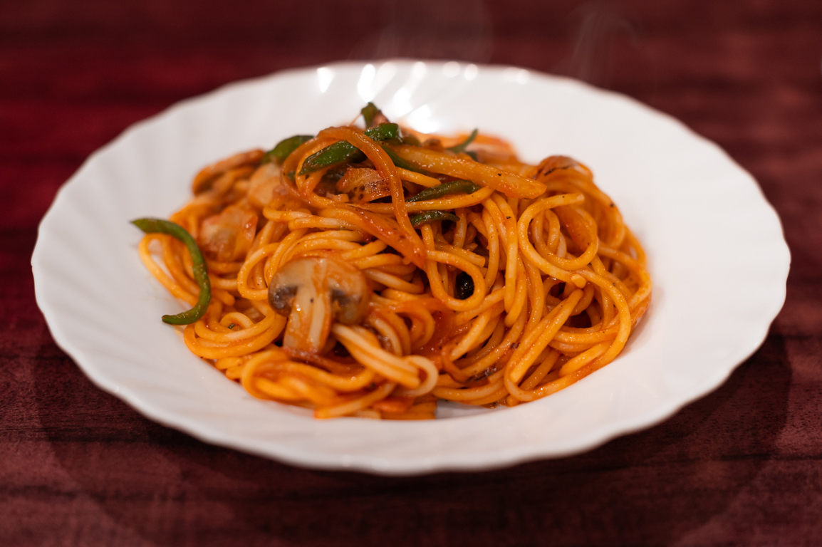 「ロッヂ赤石」の数ある“お食事系”メニューのなかで、特に人気なのがナポリタン(1,050円)です。