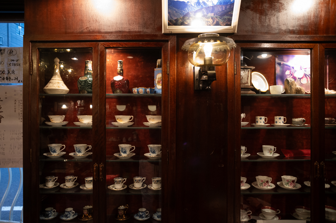 壁に掛けられた古時計や、棚に飾られたカップ&ソーサは先代夫婦のコレクション。現在は二代目が店主を務めています。
