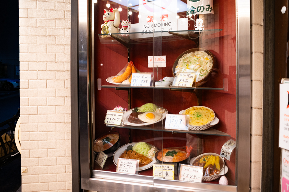 お店の入り口に、エビフライやポークソテー、かつ重などの食品サンプルが飾られている通り、「ロッヂ赤石」はお食事系が充実していて家族連れが多いのも特長です。