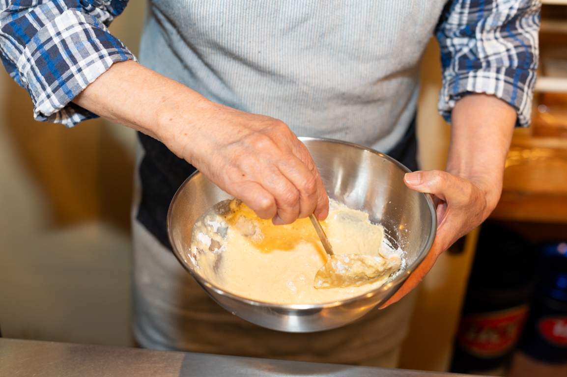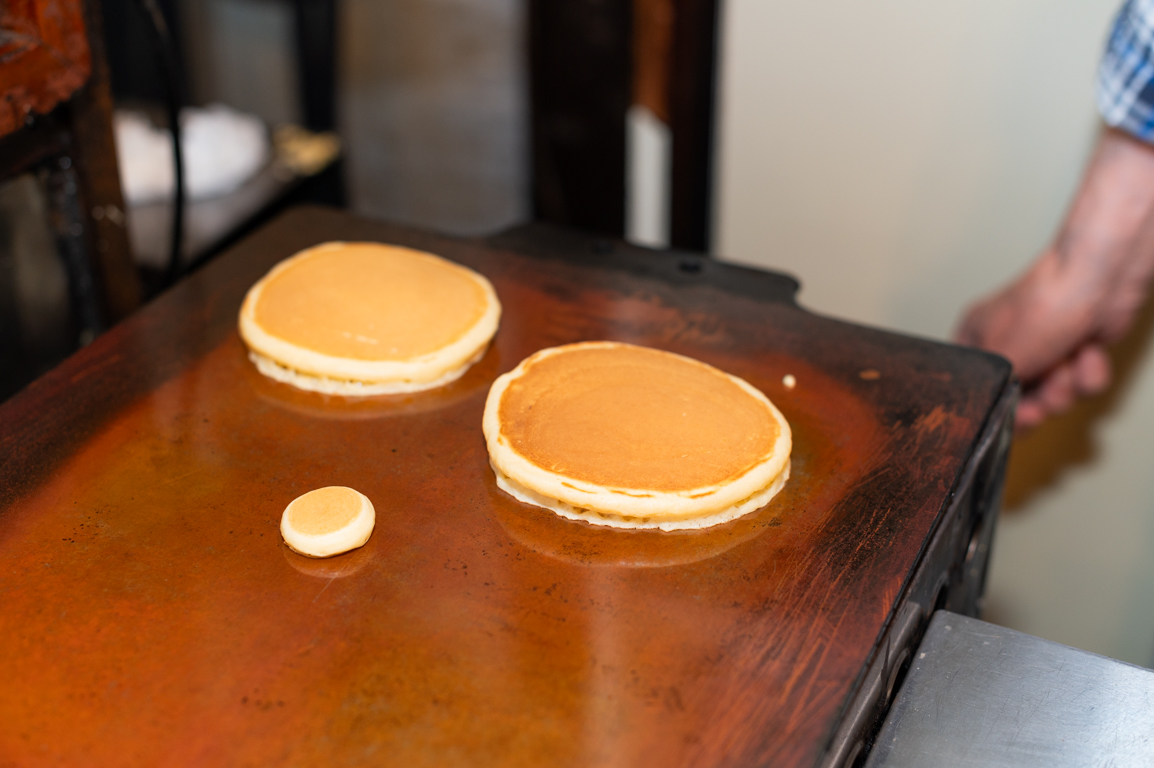 素材はいたってシンプル。オーダーが入ると牛乳、小麦粉、砂糖、卵、ベーキングパウダーを混ぜて、温めた銅板でゆっくりこんがりと焼いていきます。