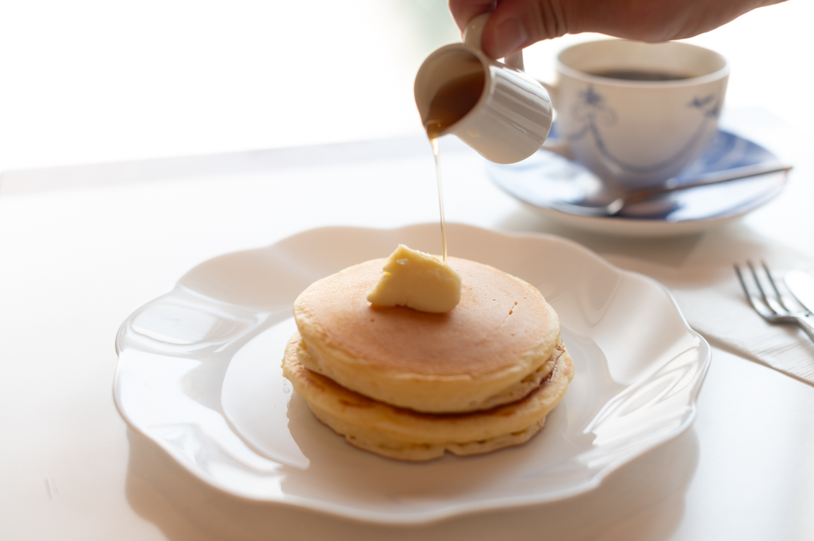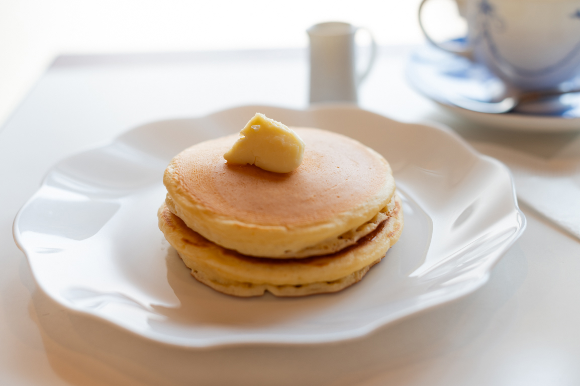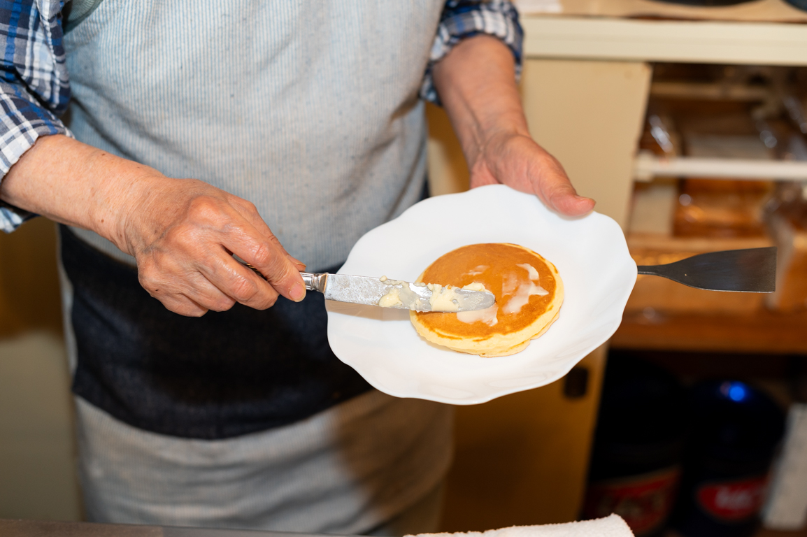 仕上げにバターを乗せて完成。素朴でやさしい甘さのホットケーキです。自家製メープルシロップをたっぷりとかけていただくと、まさに“口福”!