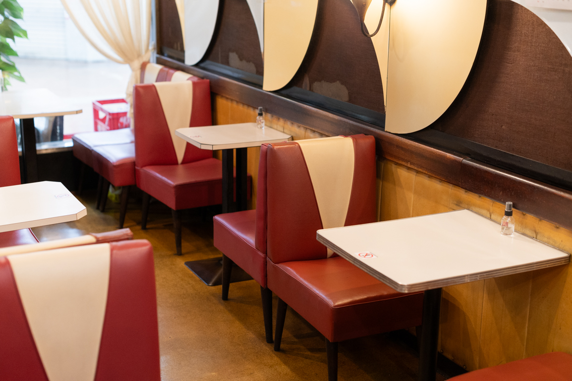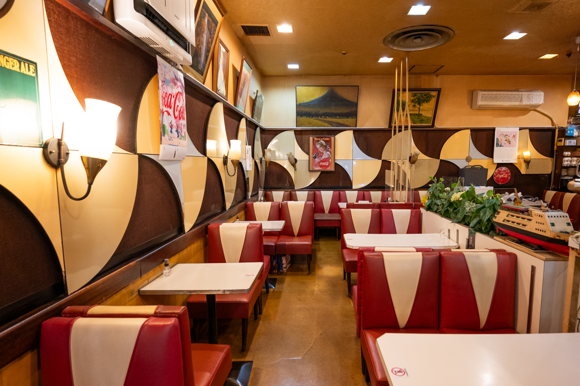お店を入ってまず目を引くのがモダンポップなインテリア。椅子のファブリックを張り替えるなどのメンテナンスを行いながら、当時の雰囲気を維持しているそうです。
