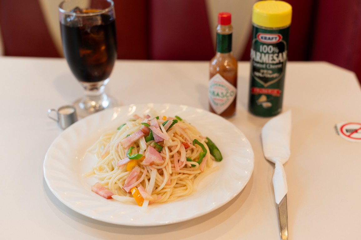 昼食などに利用する方も多く、トーストやサンドウィッチ、ホットドッグなどのメニューも人気。写真は先代が命名したという「イタリアンスパゲティ」(930円)。スパゲティが白、ピーマンやアスパラがグリーン、パプリカが赤と、イタリアの国旗にちなんで先代が命名したそう。「スパゲティって、そもそもイタリアンなんですけどね……」と店主は苦笑い。素朴でホッとする、おいしいメニューです。