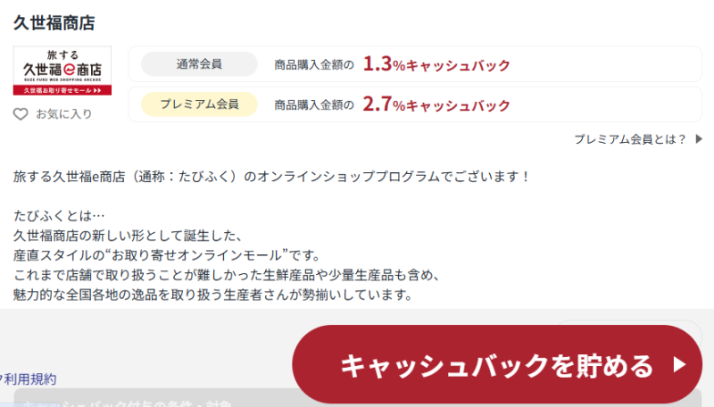 MyCloudアカウントにログインして、下画像の【キャッシュバックを貯める▶︎】ボタンをクリックしていただき、旅する久世福e商店で購入するだけです!