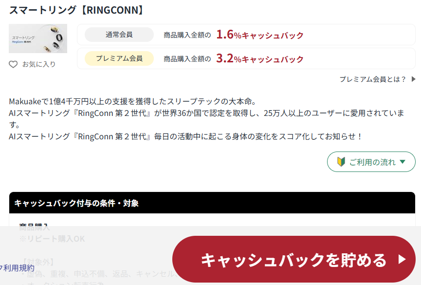 MyCloudアカウントにログインして、下画像の【キャッシュバックを貯める▶︎】ボタンをクリックしていただき、RingConnでお買い物してもらうだけです!