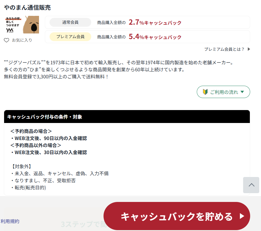 MyCloudアカウントにログインして、下画像の【キャッシュバックを貯める▶︎】ボタンをクリックしていただき、やのまん通信販売でお買い物してもらうだけです!