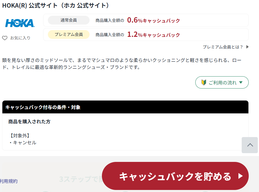 MyCloudアカウントにログインして、下画像の【キャッシュバックを貯める▶︎】ボタンをクリックしていただき、HOKA(R) 公式サイトでお買い物してもらうだけです!