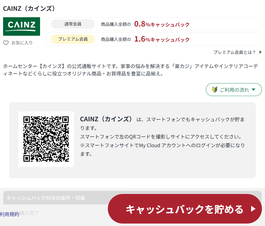 MyCloudアカウントにログインして、下画像の【キャッシュバックを貯める▶︎】ボタンをクリックしていただき、CAINZ(カインズ)でお買い物をしてもらうだけです!