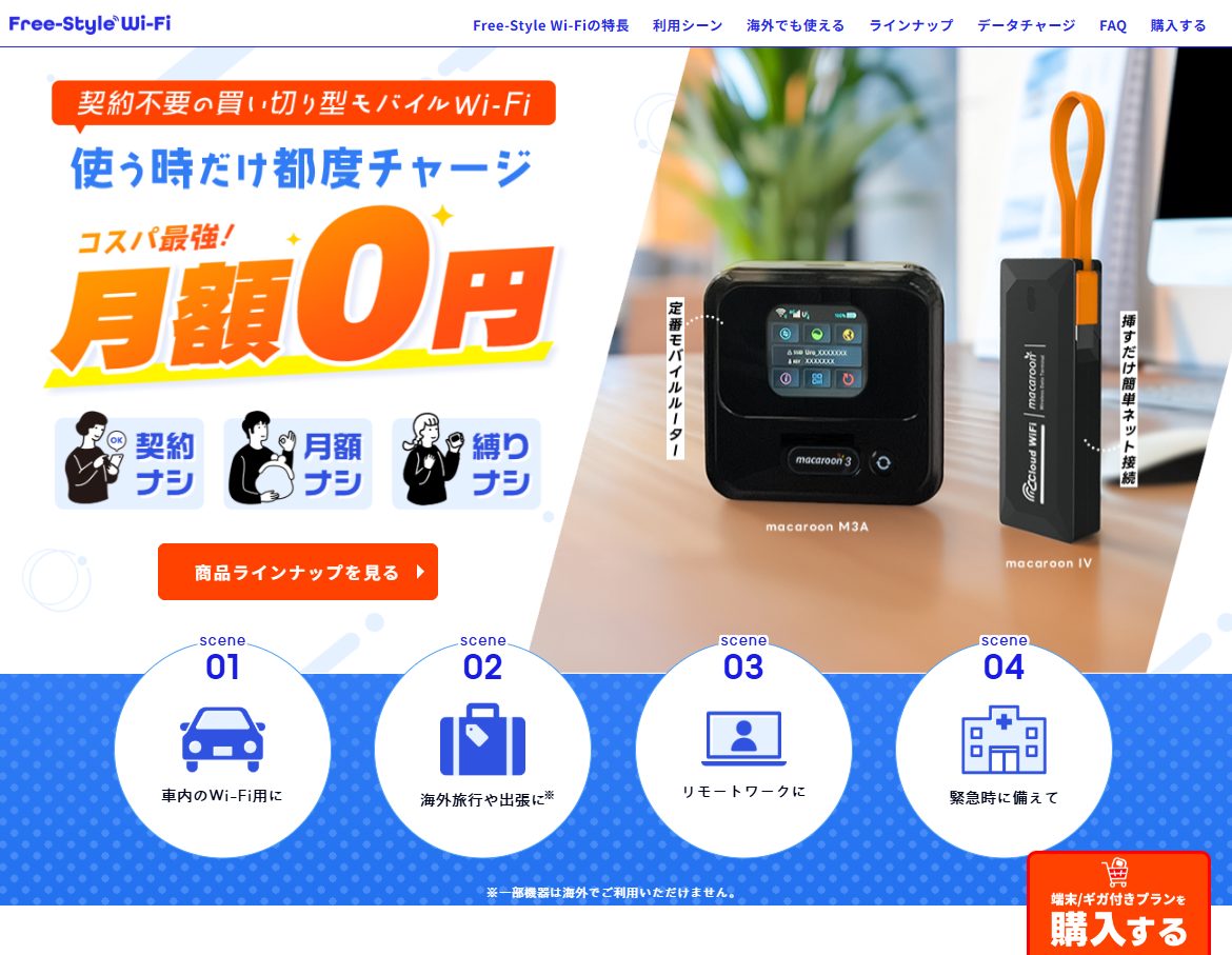 Free-Style Wi-Fiは、端末を一度購入すれば月額0円で、必要なときに必要な分だけギガを都度チャージして使える“縛りのない”モバイルWi-Fi。